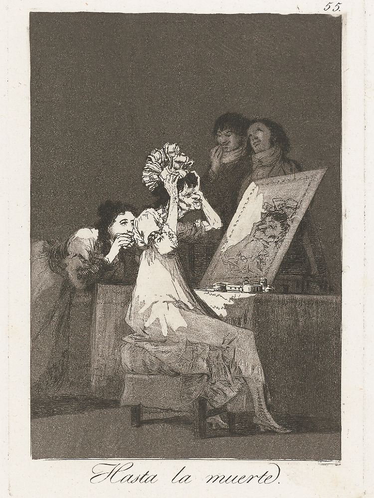 Ob in Einzelblättern wie dem erschütternden „Der Garrottierte“ oder dem erhabenen „Der sitzende Gigant“ oder in seinen berühmten Serien – den bereits erwähnten satirischen „Caprichos“, den schonungslosen „Desastres de la Guerra“, der dynamischen „Tauromaquia“ und den albtraumhaften „Disparates“ – Goya hielt sowohl Licht als auch die Schatten einer Welt im Umbruch fest, in der das Individuum häufig Opfer von Gewalt, Aberglauben oder der herrschenden Macht wurde.