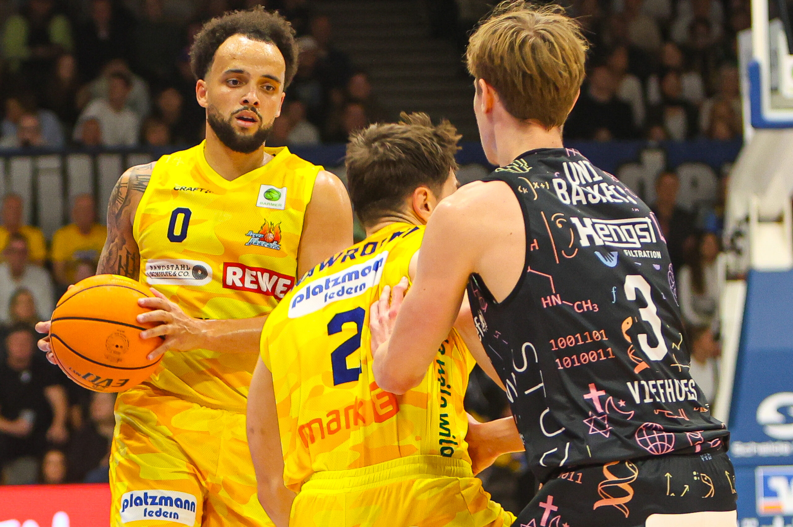 Sportlich trafen stark dezimierte Münsteraner ohne ihre drei Leistungsträger Adam Touray, Cosmo Grühn und Julius Ferber – Jason Ani ging stark gehandicapt in die Partie – auf den gastgebenden Aufstiegsanwärter in Bestbesetzung. Die Uni Baskets gerieten früh unter Druck nach dem 2:12-Start nach wenig mehr als zwei Minuten, konterten indes zum 12:14 nach einem Dreipunktspiel von Nick McMullen bis Mitte des Auftaktviertels. Es war ab jetzt ein offener Schlagabtausch – mit der verpassten Chance zum Führungswechsel durch Julian Larrys Distanzwurf (16:14, 7.), aber Bo Hodges holte immerhin per Korbleger den Ausgleich nach (16:16, 9.). Die passende Münsteraner Defensive hatte das Fundament im Viertelverlauf gelegt. 19:16 führte der Gastgeber nach Abschnitt eins.