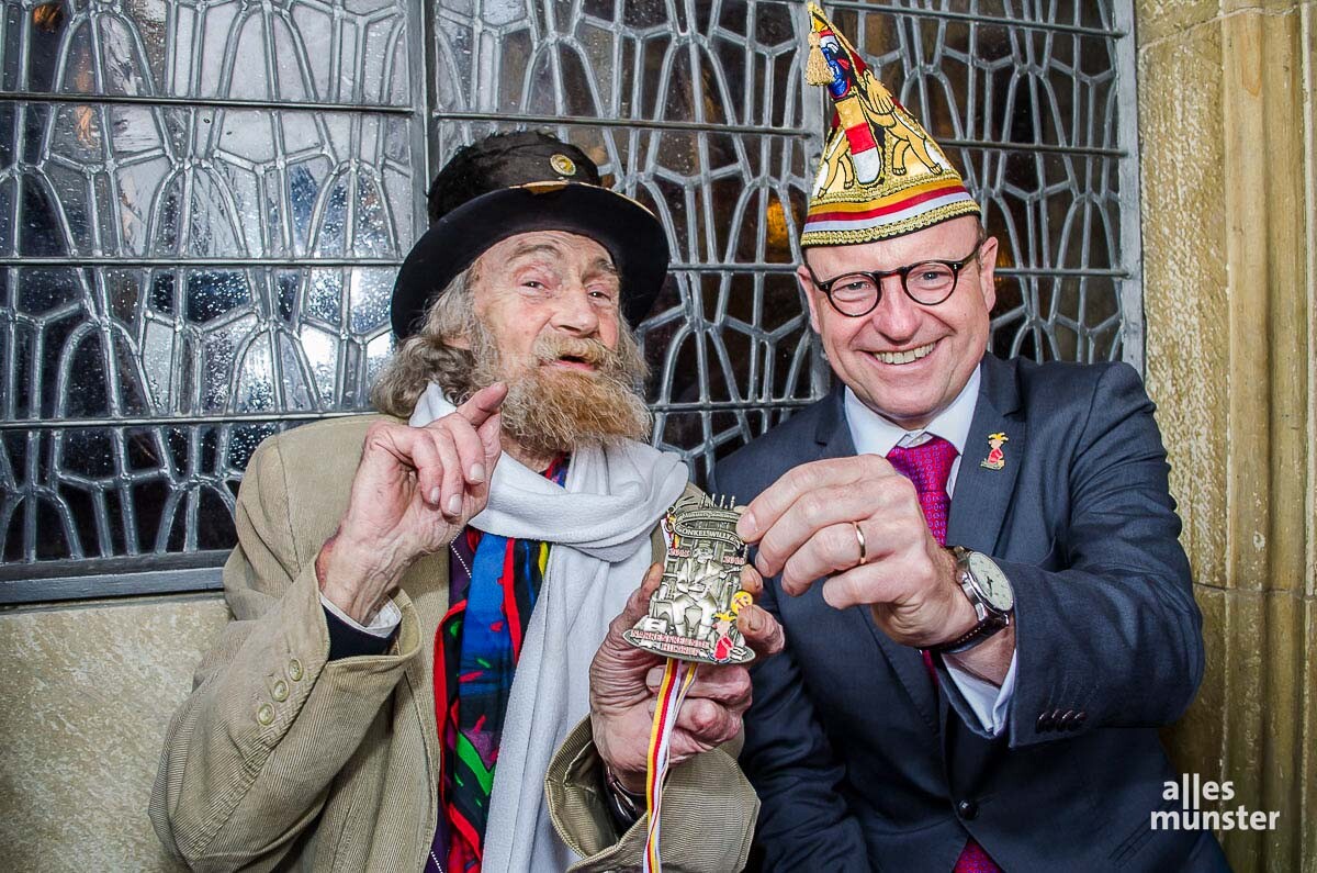 Hochrangige Gäste der Stadt werden nicht nur im Friedenssaal empfangen, sie dürfen auch aus dem goldenen Hahn trinken. Da können bei manchen Gästen auch schon mal Sicherheitsbedenken aufploppen: „Beim ersten amerikanischen Botschafter, dem ich begegnet bin und der Wein aus dem Hahn trinken durfte, waren die Sicherheitsleute doch etwas unglücklich. [lacht] Hendrick Wüst hat mir neulich gebeichtet, dass er den Wein gar nicht so toll fand. Andere fanden ihn allerdings sehr gut. Es ist ein sehr schönes Ritual mit zwei schönen Legenden. Zum einen der feste Wille der Stadtgesellschaft sich nicht erobern zu lassen, widerstandsfähig zu sein. Zum anderen ist der Hahn vielleicht das westfälische Symbol für den Adler, nämlich das Symbol der Freiheit.“ Hinter diesen Legenden steckt für das Stadtoberhaupt auch ein hochaktueller Aspekt. Menschen, die in Münster leben, sollen das Gefühl haben, dazu zu gehören. Unabhängig davon, wie lange sie schon in der Stadt leben. Auf engem Raum wird dies für Lewe im Hafen deutlich, der kein durchkapitalisierter Ort geworden sei, wie er sagt, sondern ein Ort der Ausgehkultur für alle mit Restaurants, Theater, Kino, Ruderverein und auch der B-Side, für die er sich seinerzeit starkgemacht habe. Außerdem sei die lange Mauer entlang des Hafenbeckens eine Bank für jedermann. Unabhängig davon, ob man in den dortigen Geschäften Geld ausgegeben habe oder nicht, wie Lewe betont.