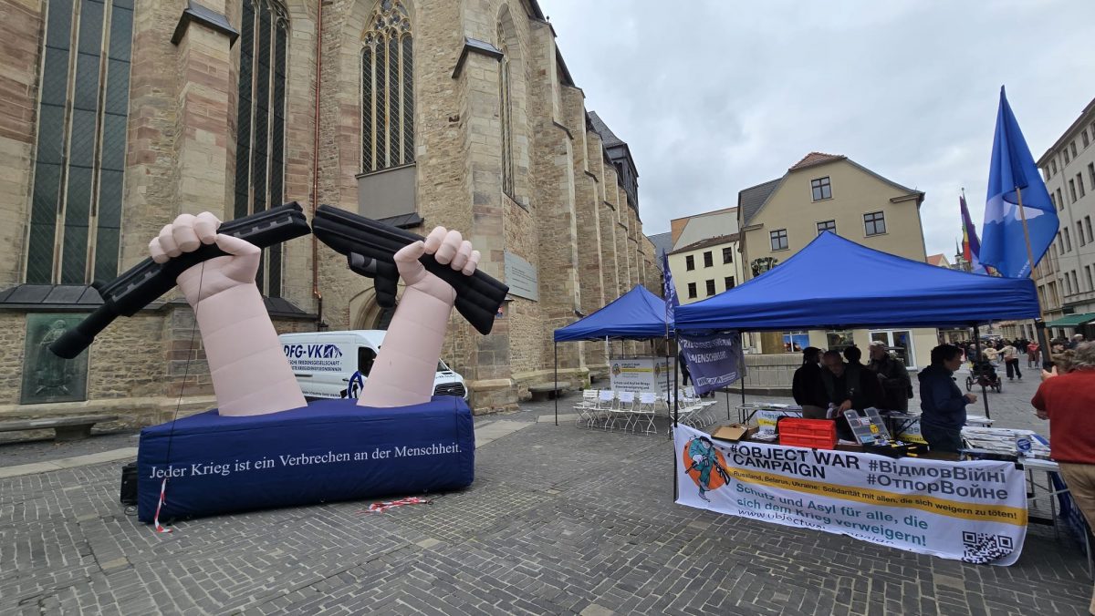 Im Rahmen einer bundesweiten Informationstour hat die Deutsche Friedensgesellschaft – Vereinigte KriegsdienstgegnerInnen (DFG-VK) am Samstag Station in Halle gemacht. Ziel der Aktion war es, insbesondere junge Menschen auf ihr Grundrecht zur Kriegsdienstverweigerung aufmerksam zu machen – ein Recht, das laut der Friedensorganisation zunehmend in Vergessenheit geraten ist.