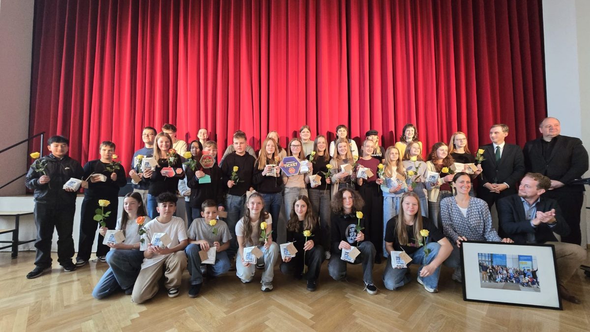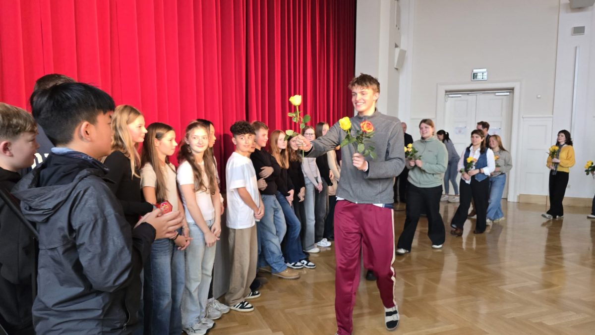 Den Preis konnten die Schülerinnen und Schüler aus den Händen von Bildungsminister Jan Riedel und René Rebenstorf, Beigeordnete für Stadtentwicklung, Umwelt und Sicherheit als Vertreter von Oberbürgermeister Dr. Alexander Vogt entgegen nehmen. „Dafür hat sich das frühe aufstehen gelohnt“, sagte Riedel, der mit seiner ganzen Familie zum Public Viewing in den Paul-Saabe-Saal, die Aula der Latina, gekommen war. Zudem gab es auch Gratulationen und Blumen von den Vorgängern um den Titel. Denn im Jahr 2018 hat die Latina schon einmal in der Show gewonnen. Und einige der damaligen Schüler waren zur Gratulation gekommen.