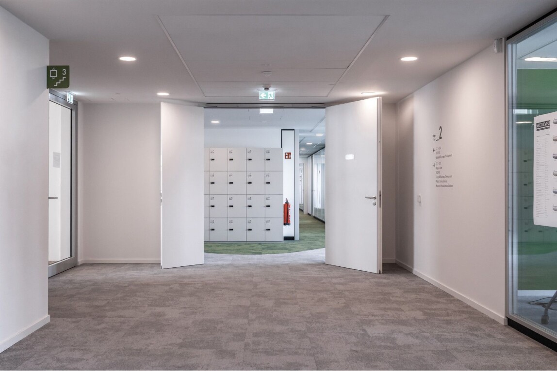 Neben der Brandschutzfunktion sind die Türanlagen mit Magnet- und Riegelkontakten sowie Fluchttürsteuerungen ausgestattet. Damit bleiben sie im Regelbetrieb offen, schließen jedoch im Brandfall automatisch.