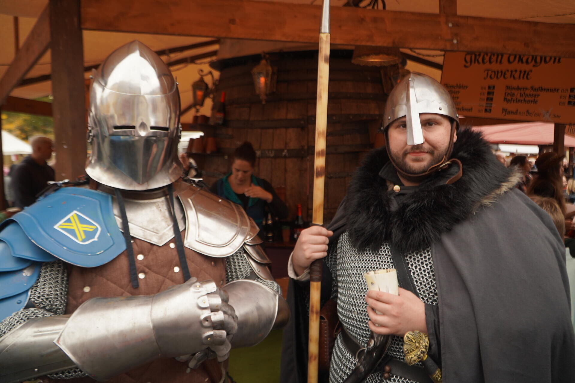 Ein Mittelaltermarkt lebt auch vom Duft der Tavernen. Entsprechend groß ist das Angebot: Deftiges Grillfleisch, Knoblauchbrot, Fischbrötchen und süße Versuchungen wie Honigfleisch oder Crêpes stillen den Hunger. In der Schenke fließt Met, dazu gibt es frisches Bier aus dem Braukessel und Säfte für Kinder. Alles wird in rustikalem Geschirr serviert – ganz wie vor Jahrhunderten.
