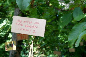 Im September hatten Teilnehmende des Workshops „Vorraum für Risse“ Kunst-, Kreativ- und Wortwerke angefertigt. Einige von diesen, vor allem auf Pappen geschriebene Fragen, hingen am Erkundungstag am Baum im Großen Galiläa und „sprachen“ Besuchende direkt an: Was ist deine Zerreißprobe? Welche Risse müssen offen bleiben? Oder, elementar: Wer bist du? Wer mochte, konnte im „stillen Baum-Gespräch“ eigene Werke dazu hängen.