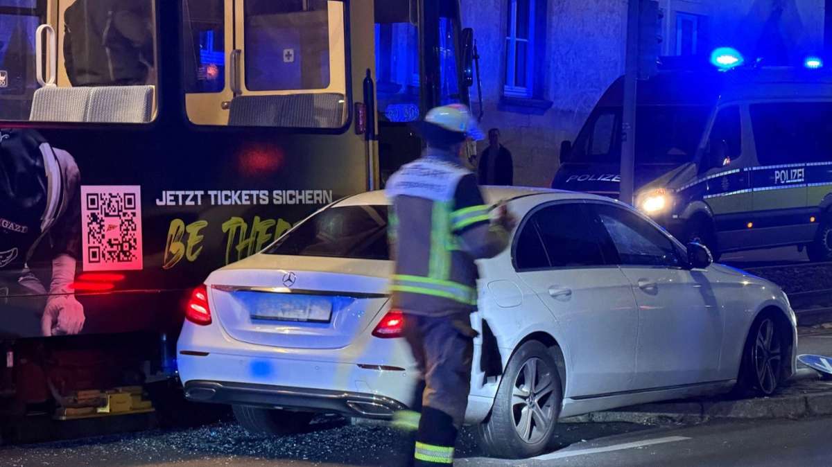 Der Unfall ereignete sich gegen 19 Uhr in der Nähe der Haltestelle Schloss-/Johannesstraße. Die Stadtbahn war in Richtung Botnang unterwegs. Nach Angaben der Polizei ist die Ursache noch unklar; der genaue Hergang müsse zunächst erfasst werden, teilte ein Sprecher mit. Die Bahn prallte gegen die linke Seite des Fahrzeugs und schob den Mercedes mehrere Meter weit – gegen ein Straßenschild und anschließend auf eine Fußgängerinsel.