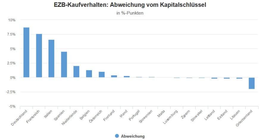 Die EZB hat beim Start des PSPP (also des Staatsanleihen-Programms) angekündigt, dass sich das Kaufvolumen am Kapitalschlüssel der beteiligten Länder orientieren soll. Jedoch ist die EZB von diesem Ziel deutlich abgewichen: Sie hat mehr Staatsanleihen der großen Eurostaaten gekauft, als dies eigentlich nach dem Kapitalschlüssel angemessen gewesen wäre. So machen beispielsweise deutsche Staatsanleihen mittlerweile knapp 27% des aufgekauften Staatsanleihen-Portfolios aus, obwohl der deutsche Kapitalschlüssel nur bei knapp 18% liegt.