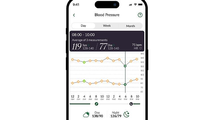 Essenziell ist die Kalibrierung des Bands, das nicht wie ein herkömmliches Blutdruckmessgerät funktioniert. Es misst den Blutdruck 20 bis 30 Mal pro Tag optisch über Photoplethysmographie (PPG) – immer nur in Ruhephasen. Dabei erfassen Lichtsensoren winzige Veränderungen des Blutflusses unter der Haut, woraus mithilfe eines Algorithmus Blutdruckwerte berechnet werden.