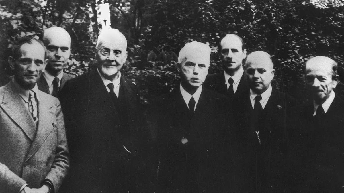 Die Unterzeichner der Stuttgarter Schulderklärung: Martin Niemöller, Wilhelm Niesel, Theophil Wurm, Hans Meiser, Heinrich Held, Hanns Lilje und Otto Dibelius (von links). Nicht im Bild sind Otto Hahn, Gustav Heinemann, Hans Asmussen und Rudolf Smend, die die Erklärung ebenfalls unterzeichnet haben. Foto: picture-alliance / epd