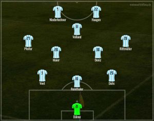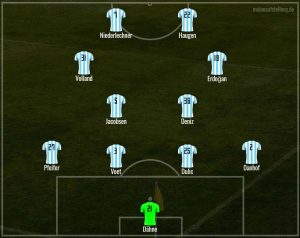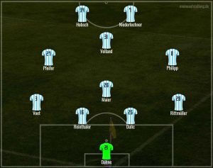 4-2-2-2 ist das System der Wahl bei Stefan, tatsächlich als einziger Redakteur auf Max Reinthaler und Marvin Rittmüller in der Startelf verzichtet. Auf der rechten Abwehrseite gibt er Tim Danhof den Vorzug, im Zentrum sollen Voet und Dulic für Stabilität sorgen. Die Doppelsechs bilden Jacobsen und Tunay Deniz, im offensiven Mittelfeld sind Kevin Volland und Startelf-Debütant Emre Erdogan dafür zuständig, die beiden Spitzen Florian Niederlechner und Sigurd Haugen in Szene zu setzen.