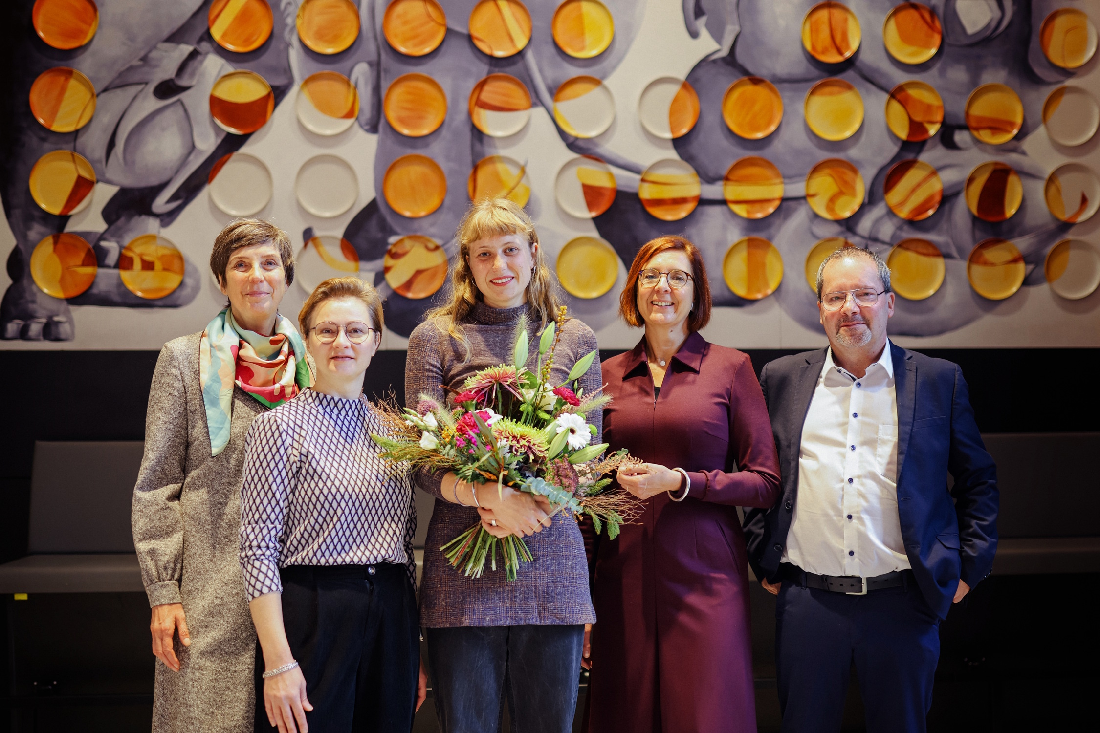 Agnes Wegner (Rektorin der Hochschule für Grafik und Buchkunst Leipzig), Kati Liebert (HGB, Betreuerin der Studierenden im Wettbewerb), Ida Lovis Hüsing (Preisträgerin), Dr. Andrea Diekhof (Geschäftsführerin Studentenwerk Leipzig), Uwe Kubaile (Abteilungsleiter Mensen & Cafeterien/Zentraler Einkauf im Studentenwerk Leipzig). Foto: Anne Schwerin