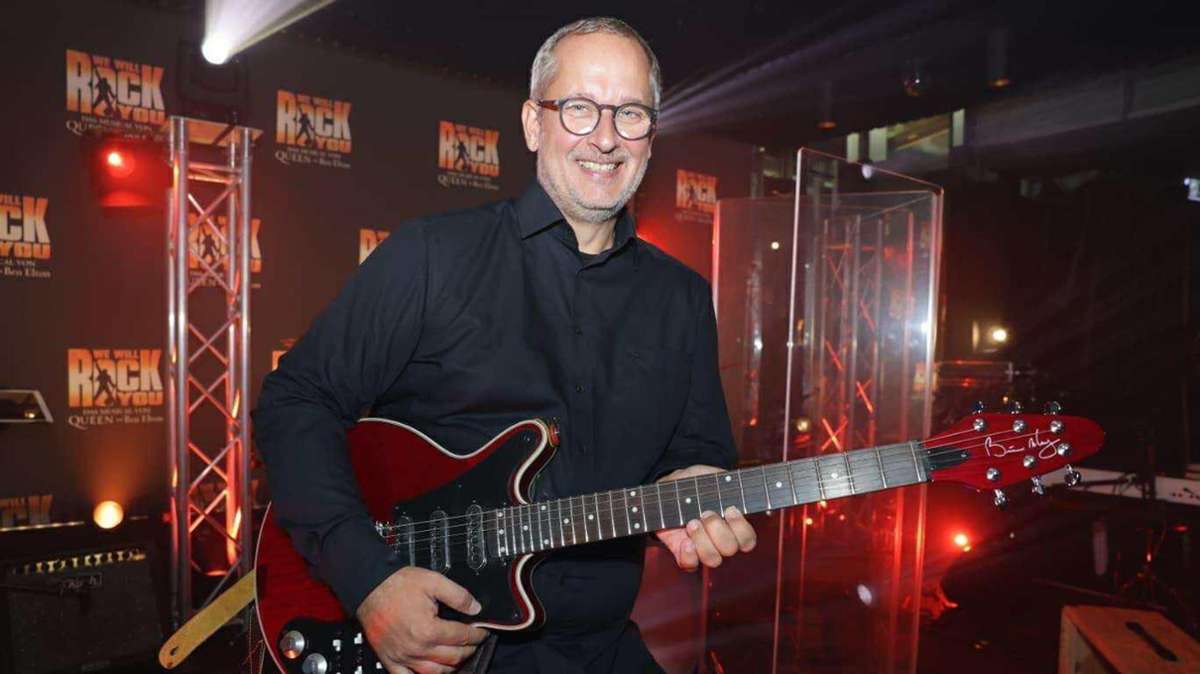 Boris Ritter, der Künstlerische Leiter von „We Will Rock You“, mit der Brian-May-Gitarre. Foto: Klaus Schnaidt