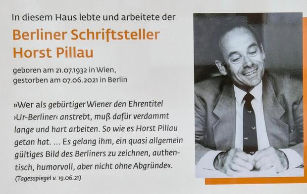 Er war einer der produktivsten und erfolgreichsten deutschen Theater- und Fernsehautoren, Spezialist für populäre Geschichten mit Tiefgang: Horst Pillau, gebürtiger Wiener, der im Juni 2021 in Berlin im Alter von 88 Jahren gestorben ist. Jetzt, gut vier Jahre nach seinem Tod, wurde im Beisein der Familie eine Gedenktafel am Haus Salzburger Straße 10 in Schönberg enthüllt, in dem er viele Jahre gelebt hat, und in dem seine Witwe Susanne noch heute lebt.