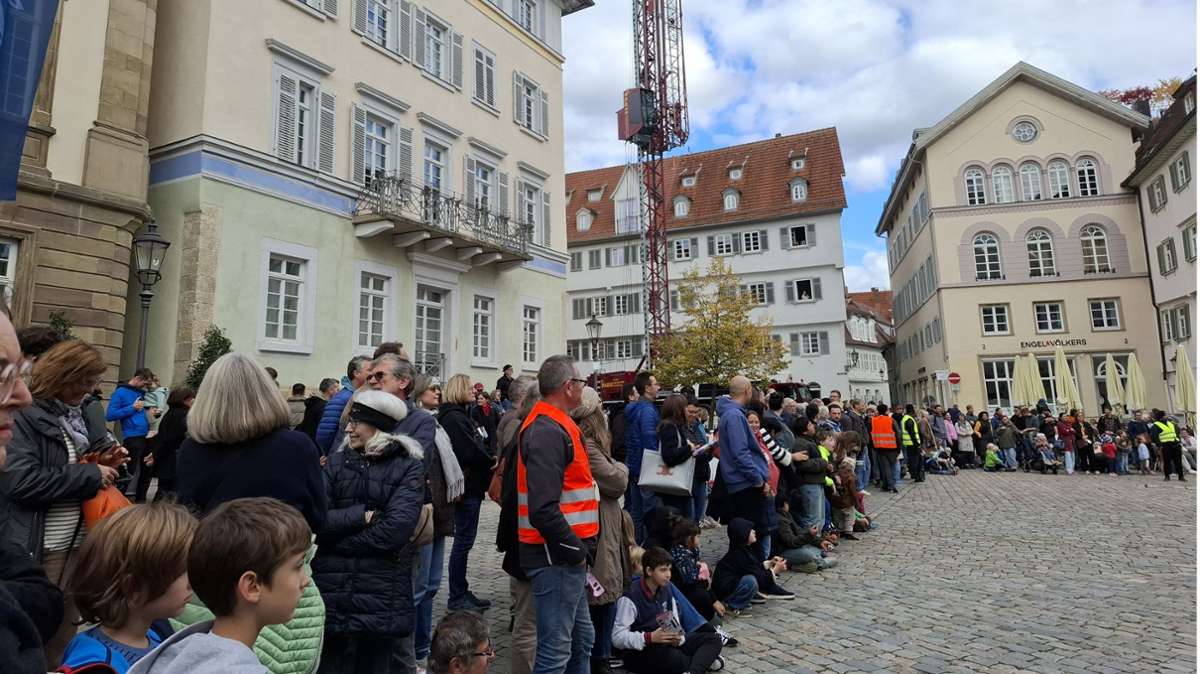 In der Grauzone zwischen freundlich und bedrohlich: Eine 16 Meter hohe Kasper-Figur stapfte mit resoluten Schritten über den Esslinger Rathausplatz. Foto: Simone Weiß