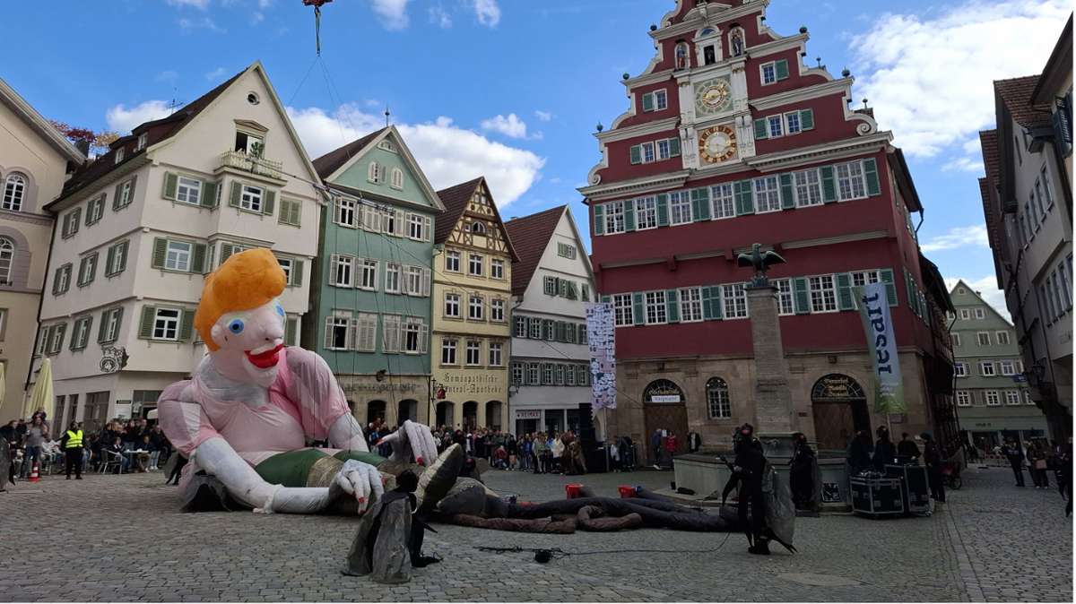 Witzig, spritzig, sympathisch, schelmisch: Nein, dieser Kasper ist anders. Eine 16 Meter hohe Figur stapfte mit einer Fliegenklatsche über den Esslinger Rathausplatz.
