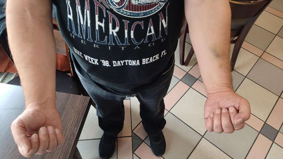 Bashaar Mahos Unterarme sind vom Zwei-Tonnen-Seat gezeichnet. Foto: Felix Mahler