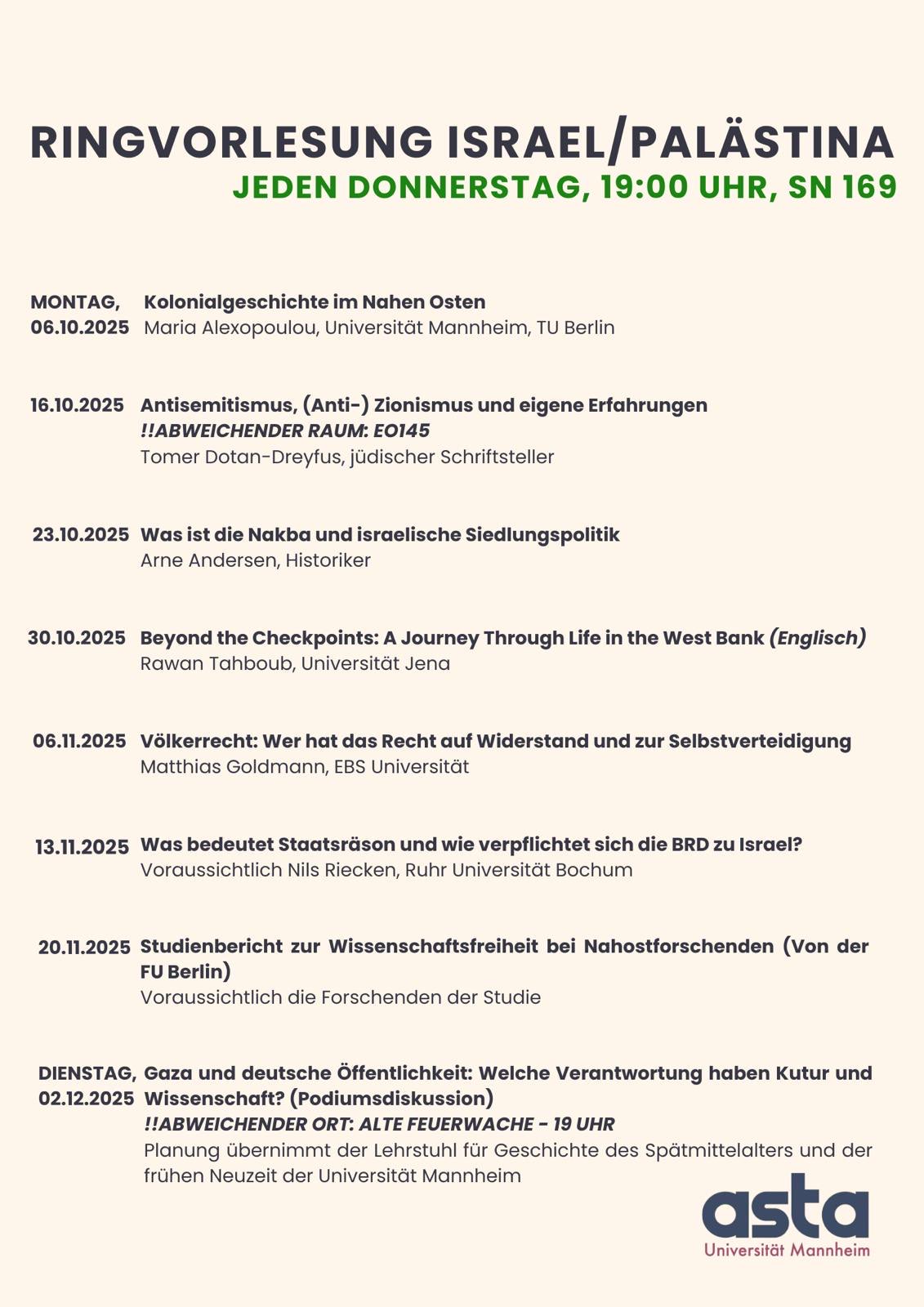 Der AstA der Uni Mannheim hat eine Ringvorlesung zu zentralen Themen der Auseinandersetzung zu Israel/Palästina organisiert. Sie wurde in Zusammenarbeit mit dem Zentrum für Antisemitismusforschung, dem Forschungsinstitut für Gesellschaftlichen Zusammenhalt und dem Lehrstuhl für Geschichte des Spätmittelalters und der frühen Neuzeit erarbeitet.