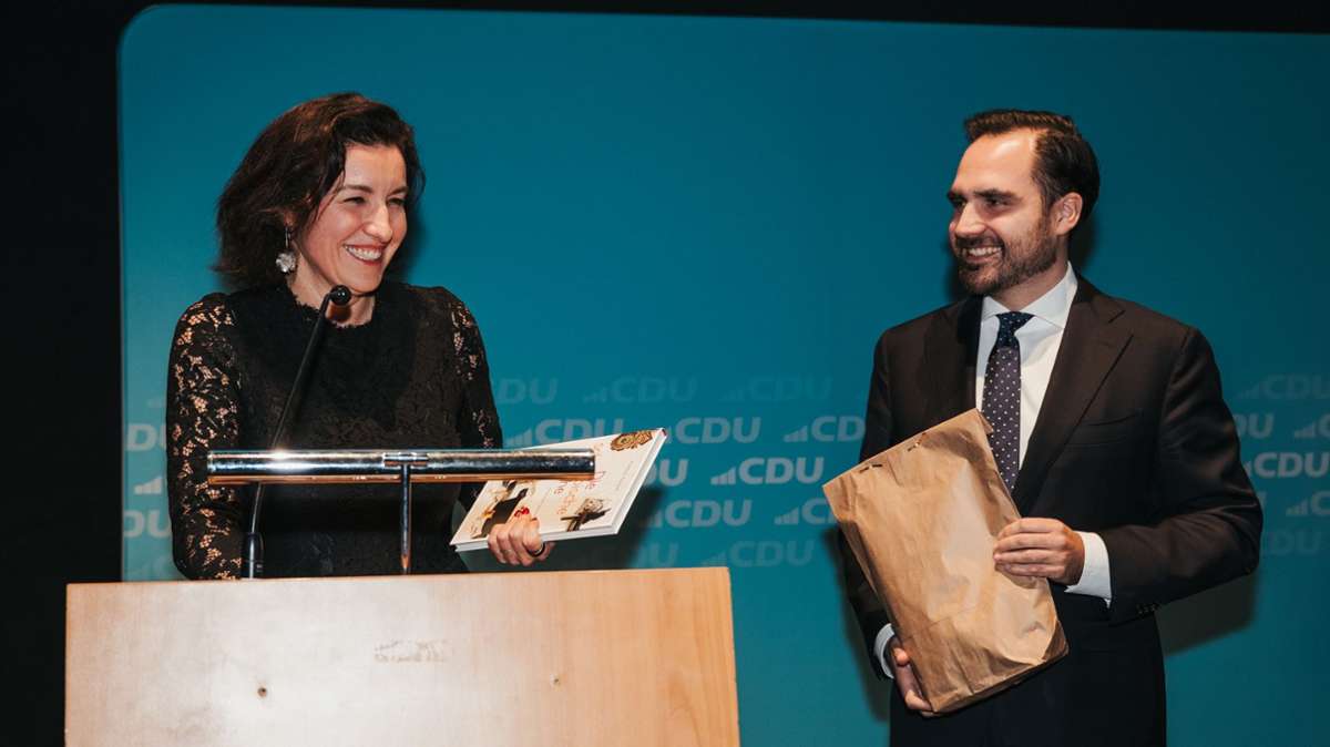 Dorothee Bär und Maximilian Mörseburg beim Festakt zu 80 Jahre CDU Stuttgart. Foto: Elias Hoh