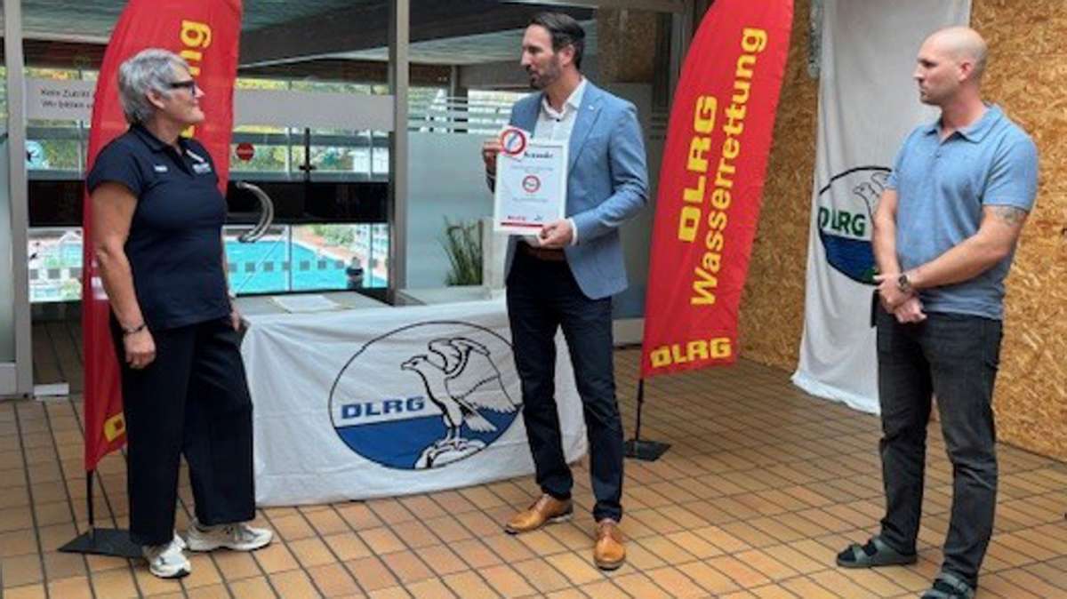 Jetzt mit Auszeichnung: Claudia Lauxmann, die Leiterin des DLRG-Stützpunkts Münchingen, hat dem Korntal-Münchinger Bürgermeister Alexander Noak (Mitte) und dem Leiter des Münchinger Freizeitbads, Sascha Bösel, die Urkunde überreicht. Foto: Stadt Korntal-Münchingen