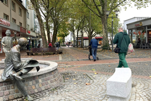 Ein bisschen heller als die beiden anderen, aber sonst gleich: Nach fast einem Jahr ist die steinerne Sitzbank am Hombrucher Brunnen ersetzt worden. © Britta Linnhoff