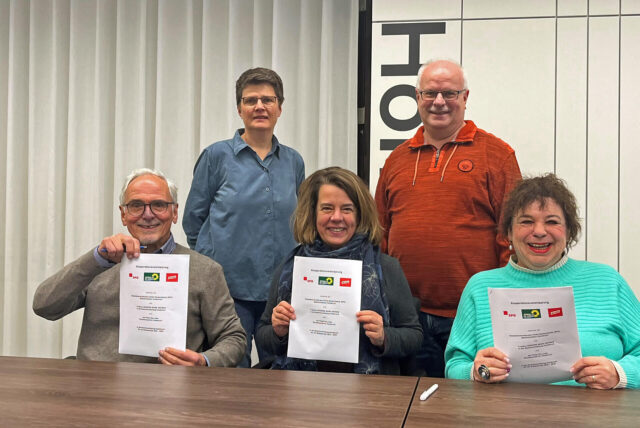 Unterzeichneten für ihre Parteien eine Kooperationsvereinbarung: Katja Wilken (Bündnis 90/Die Grünen) und Volker Schultebraucks (SPD), sitzend Michael Twardon (SPD), Susanne Lohse (Bündnis 90/Die Grünen) und Christiane Tenbensel (Die Linke). © privat