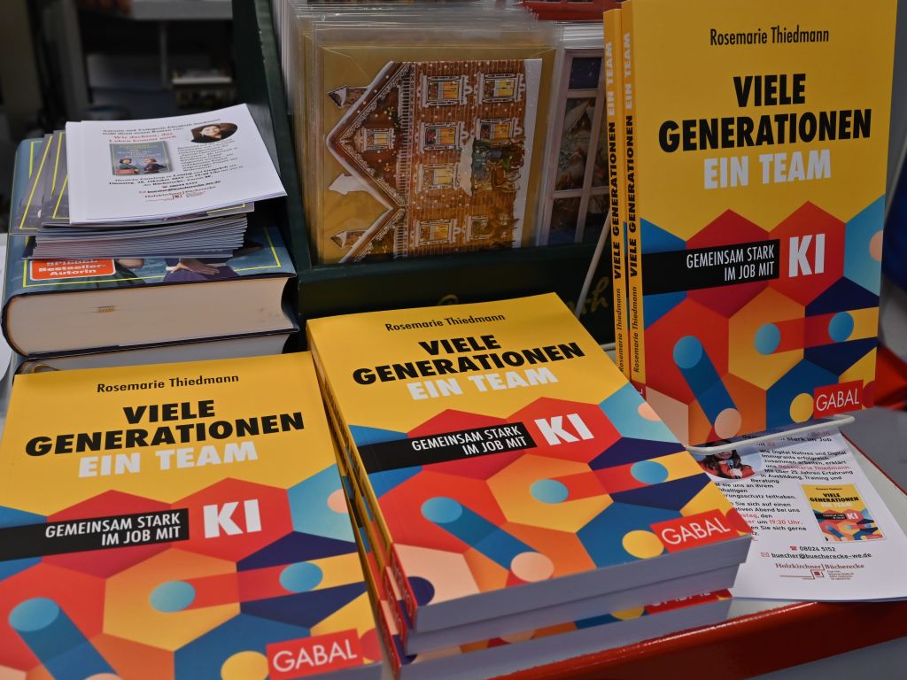 Die digitale Kluft in Unternehmen sei durch KI groß geworden, sagte Rosemarie Thiedmann, die in der Bücherecke ihr Buch „Viele Generationen, ein Team – Gemeinsam stark im Job mit KI“ vorstellte. Genau das sei das Thema, den demografischen Wandel durch KI zu unterstützen und Jung und Alt zusammenzuführen.