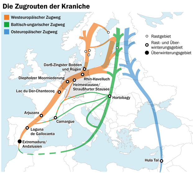 Zugrouten der Kraniche verlaufen etwa von Brandenburg aus über Sachsen-Anhalt und Thüringen nach Hessen, Rheinland-Pfalz und das Saarland. Eine nördliche Route, die von in Skandinavien brütenden Kranichen bevorzugt wird, verläuft über die vorpommersche Küste, Mecklenburg und die Diepholzer Moorniederung in Niedersachsen ins Ruhrgebiet. Auch ein Flugkorridor über Hannover und Göttingen nach Nordhessen existiert.