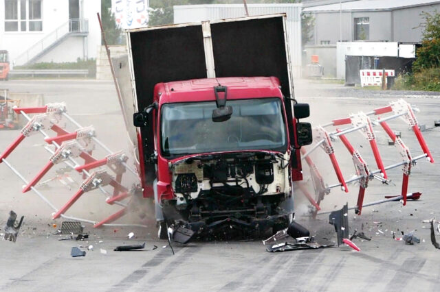 So sehen die Herner Trucksperren aus, während sie von einem Lkw „getestet“ werden. 211 dieser Einzel-Elemente gegen Terror-Attacken mit Fahrzeugen wollte Herten ursprünglich kaufen. Jetzt werden sie – geldsparend – ausgeliehen. © Herne Protect