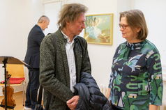 23.10.25 – Mit dem britischen Marsch „Glanz und Gloria“ als Violinsonate eröffnete Jo Lange am Sonntag die Vernissage zur Ausstellung „Quellen“ in Hofbieber-Kleinsassen (Landkreis Fulda) – also durchaus traditionell. Das war auch so gewollt, denn das ausstellende Künstler-Paar Nadeshda Streltsova und Dmitri Nayda fühlt sich selbst als „Klassiker“ und wünschte sich diese Musik. Sie studierte in ihrer Heimatstadt St. Petersburg an der Kunstakademie, er zunächst in der Ukraine, dann ebenfalls dort.
