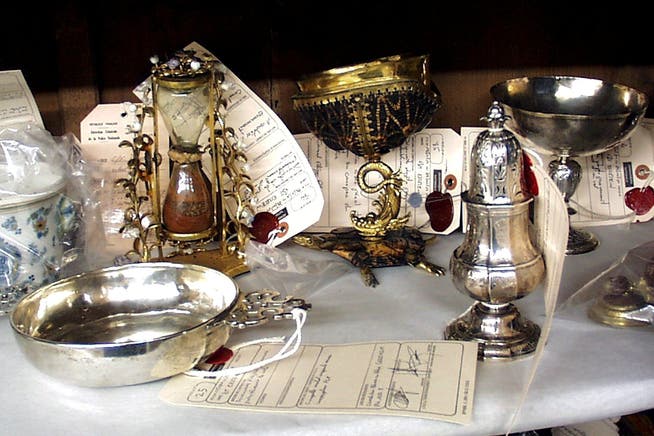 Links: Der Dieb Stéphane Breitwieser bei seinem Prozess in Strassburg im Januar 2005. Rechts: Ein Teil der Beute Breitwiesers. Der französische Dieb stahl nicht nur Gemälde, sondern auch Objekte aus Silber, Elfenbein, Uhren und weiteren Schmuck.