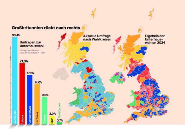 In Umfragen liegt seine Reform-Partei mittlerweile bei bis zu 30 Prozent. Die einst so mächtigen Tories stehen am Rande der Bedeutungslosigkeit, und die Beliebtheitswerte der regierenden Labour-Partei sind kollabiert. Bei den Wahlen im Juli vergangenen Jahres erreichten sie mehr als 37 Prozent der Stimmen, heute liegen sie bei 21 Prozent. Es ist das schlechteste Ergebnis einer Regierungspartei seit Beginn der Umfragen im Jahr 1983. Und Labour-Chef Keir Starmer ist der unbeliebteste Premier aller Zeiten.
