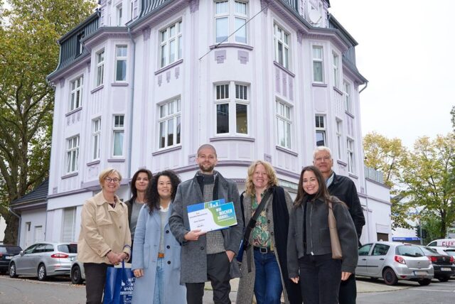 Die Hausbesitzer des Wohn- und Geschäftshauses in der Schloßstraße 27 in Westerholt erhielten den zweiten Preis, da es den historischen Charakter der Gründerzeit in besonderer Weise bewahrt. Mit im Bild sind Teile der Jury aus Verantwortlichen der Städte Herten und Gelsenkirchen. © Martin Schmüdderich