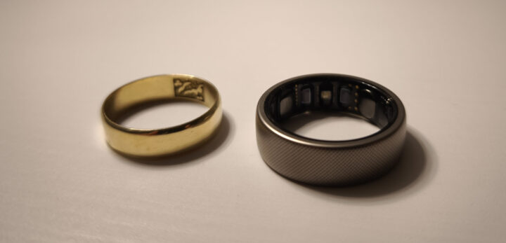 Auf den ersten Blick wirkt der Amazfit Helio Ring in Größe 12 ziemlich bombastisch. Unten habe ich das anhand eines Vergleichsbildes mit meinem Ehering einmal illustriert.