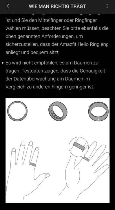 Idealerweise soll man den Helio Ring laut Amazfit am Zeigefinger tragen. Meiner ist aber tatsächlich selbst für Größe 12 zu dick, sodass ich auf den Ringfinger ausweichen musste. Eine kleine Markierung zeigt dabei an, welche Seite nach oben und welche nach unten gehört, damit die integrierten Sensoren bestmöglich messen können. Was ihr wissen solltet: Bei einer Smartwatch oder einem Fitnesstracker könnt ihr natürlich z. B. jederzeit auf Abruf den Puls messen und am Handgelenk anzeigen lassen. Beim Helio Ring kommt ihr ad hoc nicht an schnelle Daten, sondern nur im Rahmen der Übersicht oder nach einem Training.
