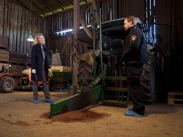 Geköpft: Charlotte Lindholm (Maria Furtwängler) und Olaf Gehrke (Ole Fischer) untersuchen den Heuballenschneider, durch den Hofmitarbeiter Victor ums Leben gekommen ist.
