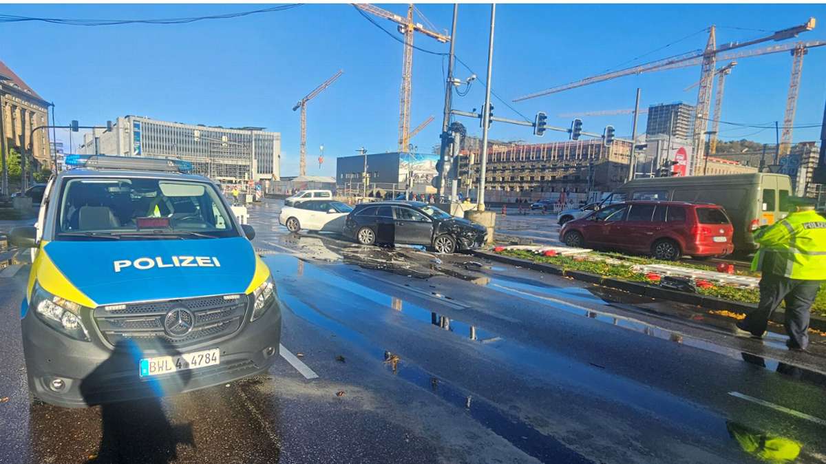 Drei Autos krachen am Hauptbahnhof in Stuttgart ineinander. Der Verkehr in der Innenstadt stockt nach dem Unfall.