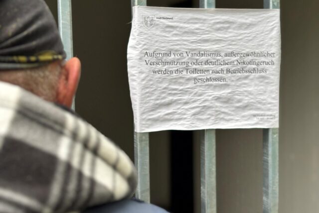 Der Wohnungslose Werner steht vor der abgesperrten Toilettenanlage des Bezirksfriedhofs Huckarde. Sie war auch für ihn quasi ein Zufluchtsort. © Uwe von Schirp