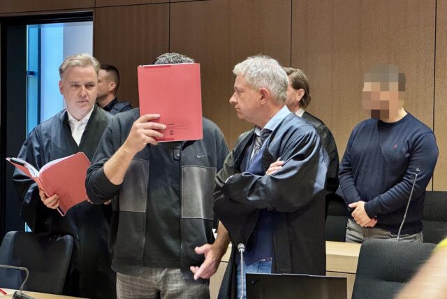 Die zwei Angeklagten neben ihren Verteidigern beim Prozessauftakt Mitte August vor dem Bochumer Schwurgericht. © Martin von Braunschweig