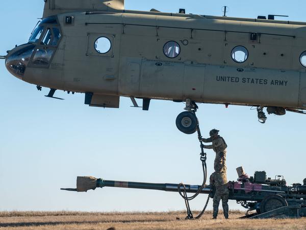 US-Artilleristen der Charlie-Batterie führen am 5. Januar 2024 auf dem Luftwaffenstützpunkt Mihail Kogălniceanu in Rumänien Übungen zum Lastentransport durch.