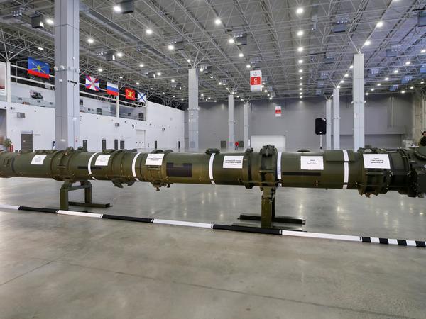 Eine Komponente des Marschflugkörpersystems SSC-8/9M729 wird am 23. Januar 2019 im Patriot Expocentre bei Moskau präsentiert.