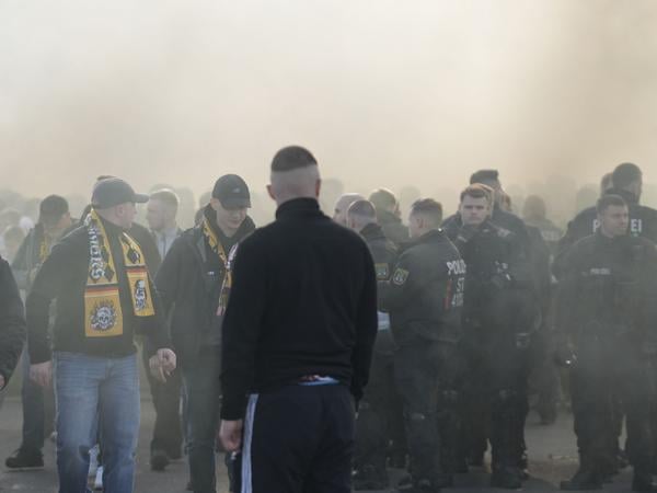 Schall und Rauch. In dem Qualm der Pyrotechnik eingehüllt, stehen Dynamo-Fans und Polizisten vorm Olympiastadion.