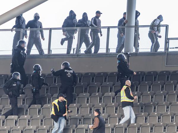 Laut ersten Informationen der Polizei sind mehrere hundert gewalttätige Fans beider Lager im Stadion aneinander geraten. Ordnerdienst und Polizeikräfte haben die Gruppen demnach trennen können, es wurde Pfefferspray eingesetzt. Verletzte oder Festnahmen gab es laut Polizei nicht. Videomaterial des Vorfalls werde nun ausgewertet, so ein Polizeisprecher. Wer „angefangen“ hat, sei aber bislang unklar. Nun seien Anzeigen wegen Landfriedensbruch gefertigt worden.