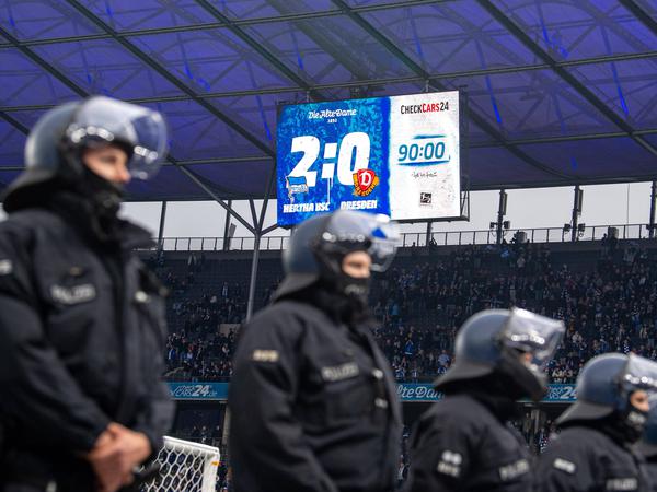 Die Polizei ist im Großeinsatz: Mehr als 1000 Beamte aus mehreren Bundesländern sollen Krawalle verhindern. Im Fokus steht die Rivalität von Hertha- und Dynamo-Fans – im Stadion kommt es zur Konfrontation.