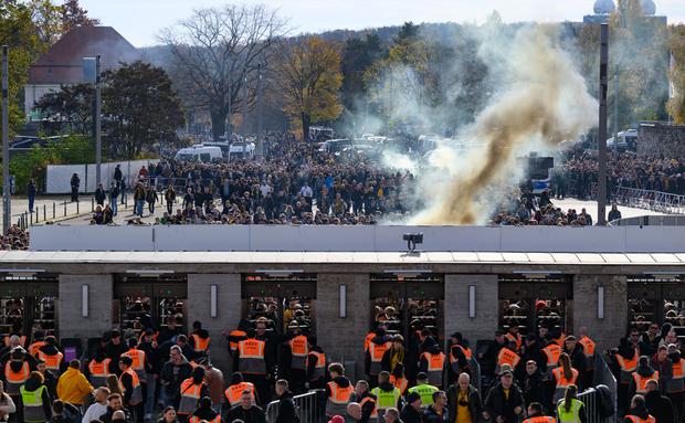Vor dem Südeingang des Stadions warten tausende Dynamofans. Einige Angereiste rätseln, wo denn der Eingang ist – den kann man nämlich von den hinteren Reihen aus nicht erkennen. Die Polizei ist mit zahlreichen Kräften vor Ort, auch Wasserwerfer-Fahrzeuge sind zu sehen. Einige Fans zünden Rauchbomben.