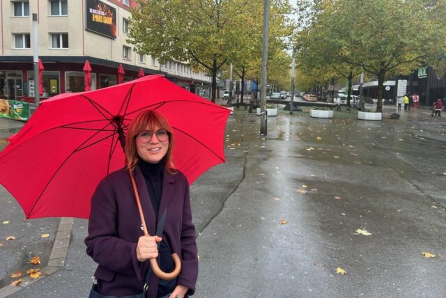 Sandy Mertmann macht sich für mehr öffentliche Toiletten in der Innenstadt – wie hier an der Kampstraße – stark. © Oliver Volmerich