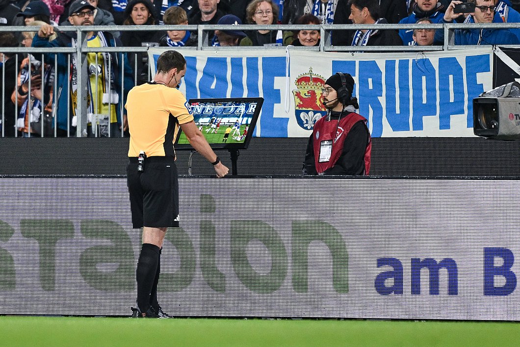 Schiedsrichter Richard Hempel schaut sich die strittige Szene am Monitor an und entscheidet: kein Strafstoß.