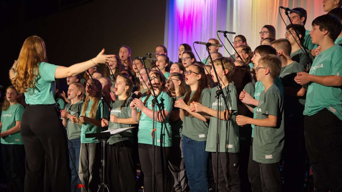 Der Chor mit 70 Jungen und Mädchen sang unter Leitung von Elisa Schmidt – dazu spielte eine Band mit Saxofon, Violine, Gitarre, Bass, Keyboard und Schlagzeug.