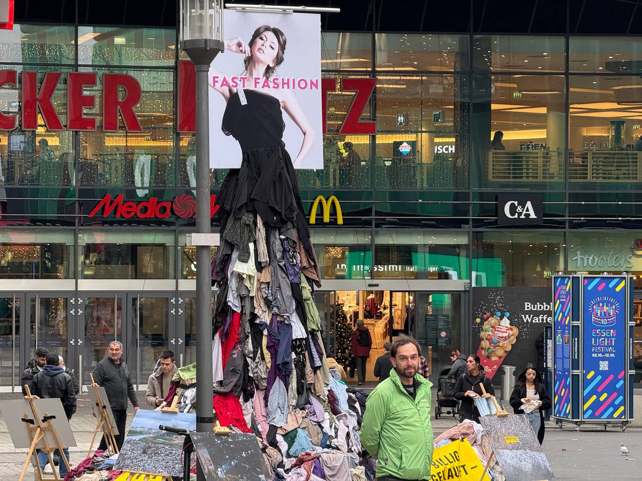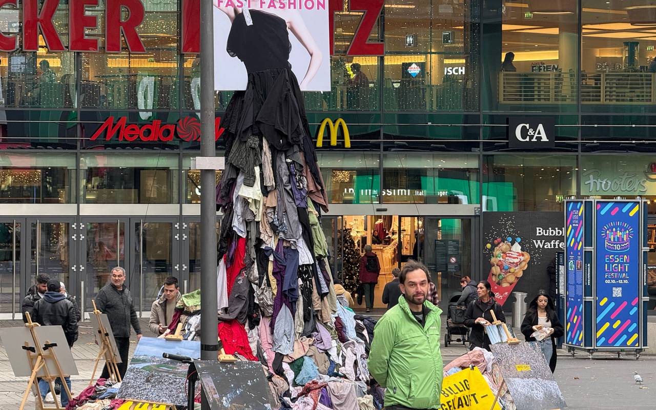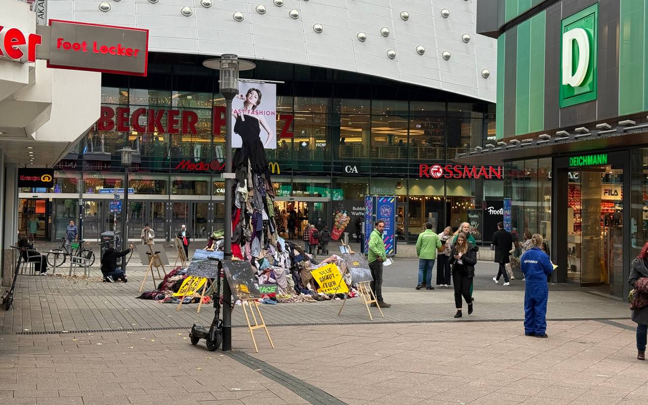 In der Innenstadt in Essen steht eine Statue aus alter Kleidung mit der Überschrift „Fast Fashion“. Die hat Greenpeace hier aufgestellt. Direkt am Limbecker Platz soll sie Aufmerksamkeit erregen und die Folgen der Massenproduktion aufzeigen.