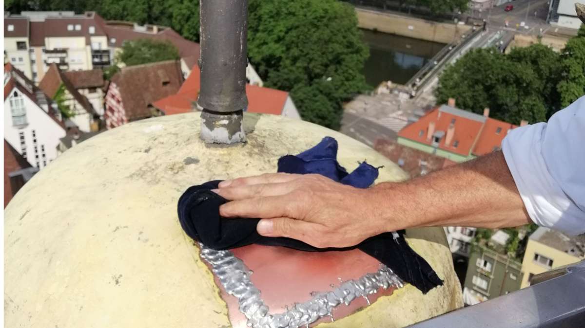 Seit 3. Juni sind die Zeitkapseln wieder im Turmknopf. Foto: Schultz-Berg Themen sind der bedrohten Frieden, Hunger und Armut