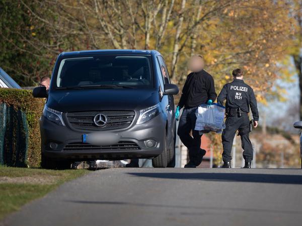 Ein Ermittler läuft mit Plastiktüten, in der sich Sportschuhe befinden, bei einer Hausdurchsuchung in Reimershagen über die Straße.