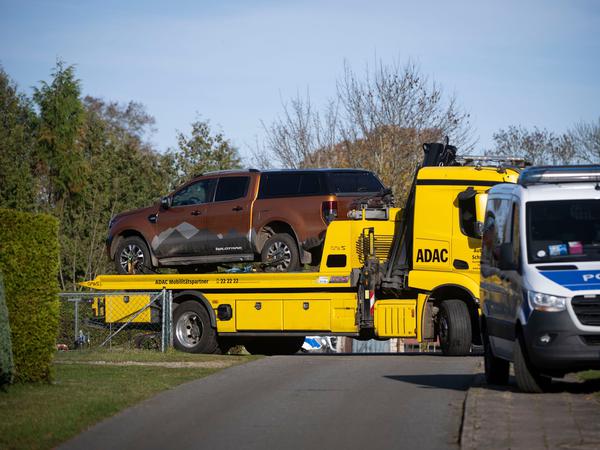 Ein Abschleppwagen transportiert einen Geländewagen im Rahmen einer Hausdurchsuchung in Reimershagen.